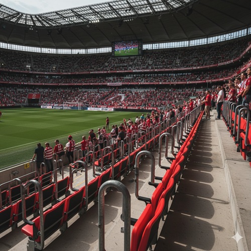 - ที่นั่งรางนิรภัย (Rail Seats) — เป็นเก้าอี้พับได้ที่มาพร้อมราวกั้นต่อเนื่อง ใช้ในโซนแฟนคลับหลักเพื่อรองรับการยืนที่ปลอดภัยมากขึ้น ซึ่งสามารถสลับโหมด “ยืน” กับ “นั่ง” ให้สอดคล้องกับกฎการแข่งขันต่างรายการได้