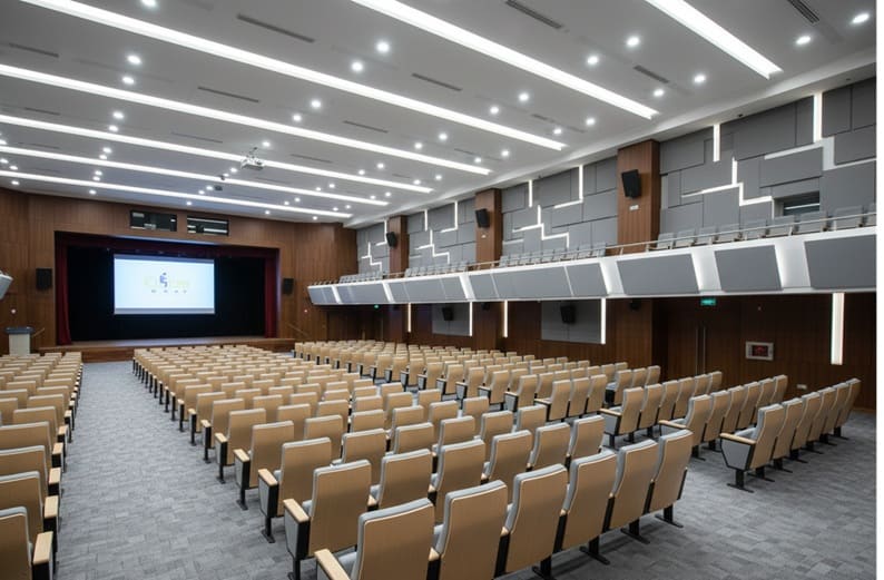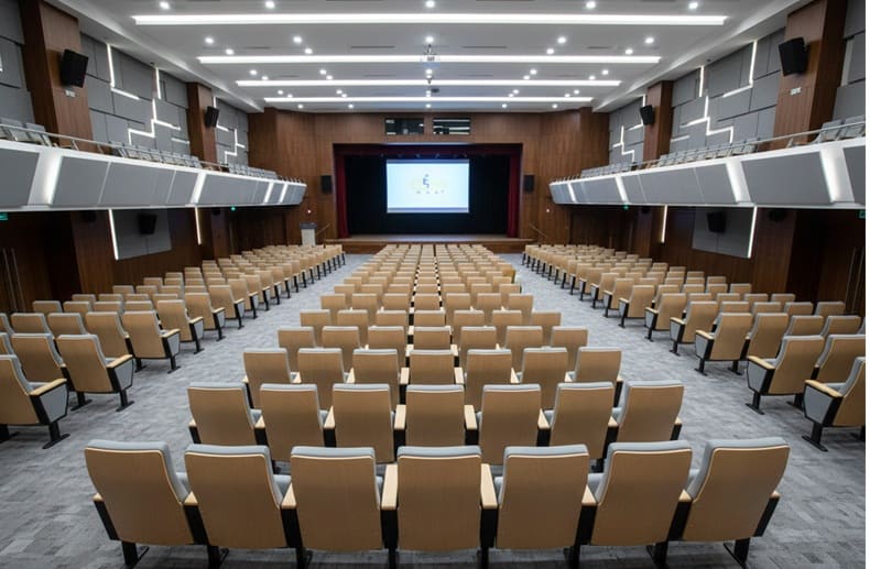 โครงสร้างเก้าอี้ยึดติดกับพื้น เพิ่มความมั่นคงและความเป็นระเบียบของพื้นที่นั่ง ด้านข้างและแผ่นพนักพิงด้านหลังตกแต่งด้วยวัสดุลายไม้ พร้อมแผ่นเจาะรูช่วยระบายอากาศ เพิ่มทั้งฟังก์ชันและความสวยงาม สามารถเลือกปรับสีผ้า วัสดุ และโทนไม้ให้สอดคล้องกับการออกแบบของห้องหรืออาคาร เหมาะสำหรับหอประชุมมหาวิทยาลัย ห้องประชุมองค์กร และโรงละครสมัยใหม่